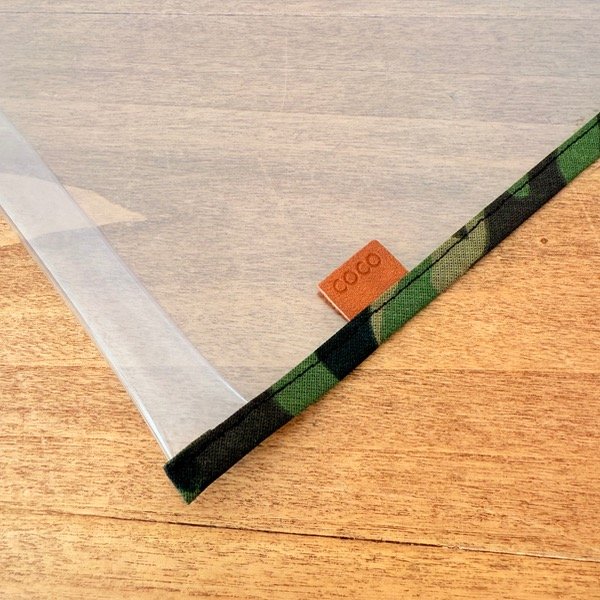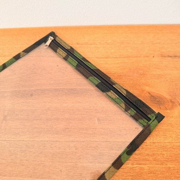 Sobre de nylon cristal con cierre y detalles en cinta bies.