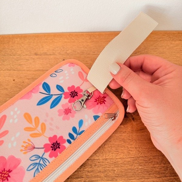 Mosquetón para colgar las llaves y correa de cinta mochilera poliéster para llevar en la muñeca o colgarla del apoya brazo de la reposera.