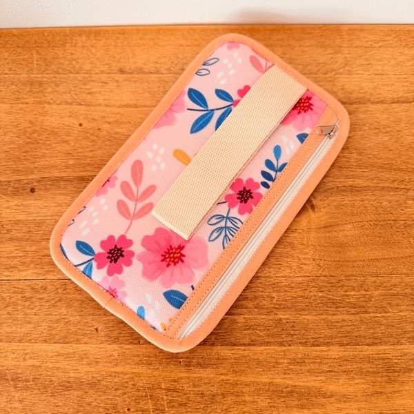 Estuche de tela cordura bondeada, impermeable y acolchonada con bolsillo transparente al frente y estampado detrás.