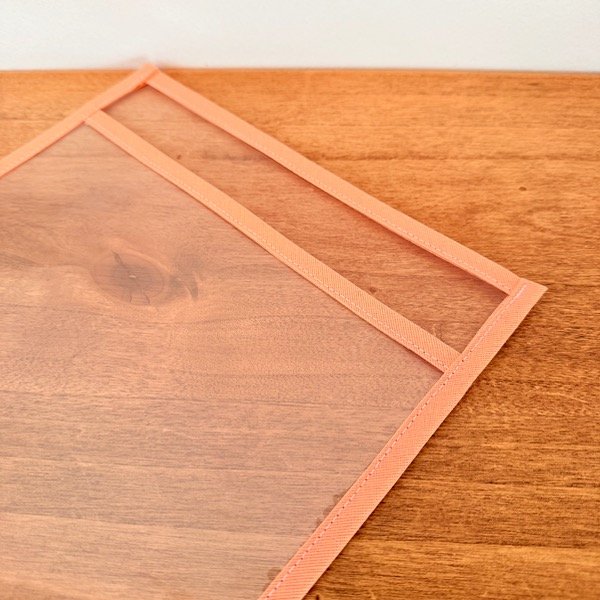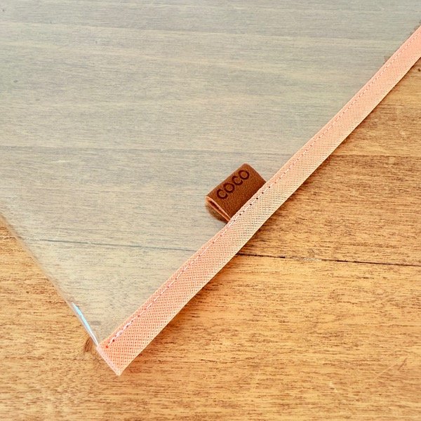 Sobre de nylon cristal PVC de alta calidad con terminaciones de cinta bies y cierre.